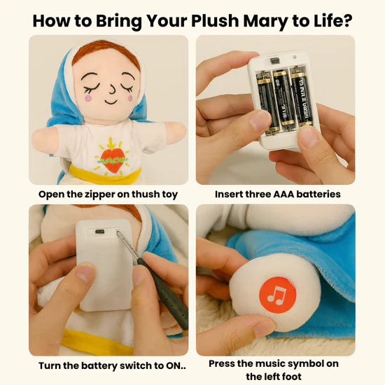 It works with three AAA batteries (not included). The module stays safely protected inside the plush.